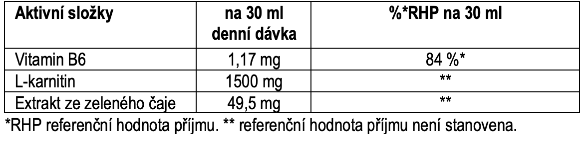 Product Code 1002501Doplněk stravy v tekuté formě s vysokým obsahem L-karnitinu (1500 mg v denní dávce), obohacený o extrakt ze zeleného čaje a vitamin B6. Svěží broskvovo-jablečná příchuť zpříjemní každodenní užívání. Vitamin B6 přispívá ke snížení míry únavy a vyčerpání a podporuje správný energetický metabolismus.