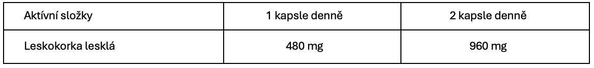 Složení: Leskokorka lesklá (Ganoderma lucidum), hydroxypropylmethylcelulóza (HPMC), protispékavá látka: stearát hořečnatý.