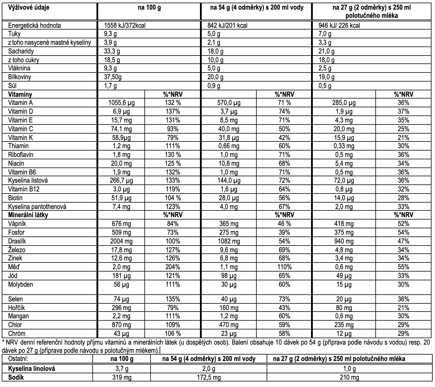 Složení: hrachový bílkovinný izolát, fruktóza, světlice barvířská – olej ze semen v prášku (Carthamus tinctorius), inulin, glycerofosfát draselný, kakao, citrát draselný, aroma: čokoládové, uhličitan vápenatý, sůl, chlorid vápenatý, zahušťovadla: xanthan, arabská guma; barvivo: karamel, oxid hořečnatý, emulgátor: slunečnicový lecitin, L-askorbová kyselina, sladidlo: steviol-glykosidy ze stévie, fumarát železnatý, síran zinečnatý, DL-α-tokoferyl-acetát, nikotinamid, glukonan měďnatý, D-pantothenát vápenatý, retinyl-palmitát, síran manganatý, pyridoxin-hydrochlorid, riboflavin, thiamin-mononitrát, fytomenadion, chrom-pikolinát, kyselina pteroylmonoglutamová, jodid draselný, seleničitan sodný, molybdenan sodný, D-biotin, cholekalciferol, kyanokobalamin.