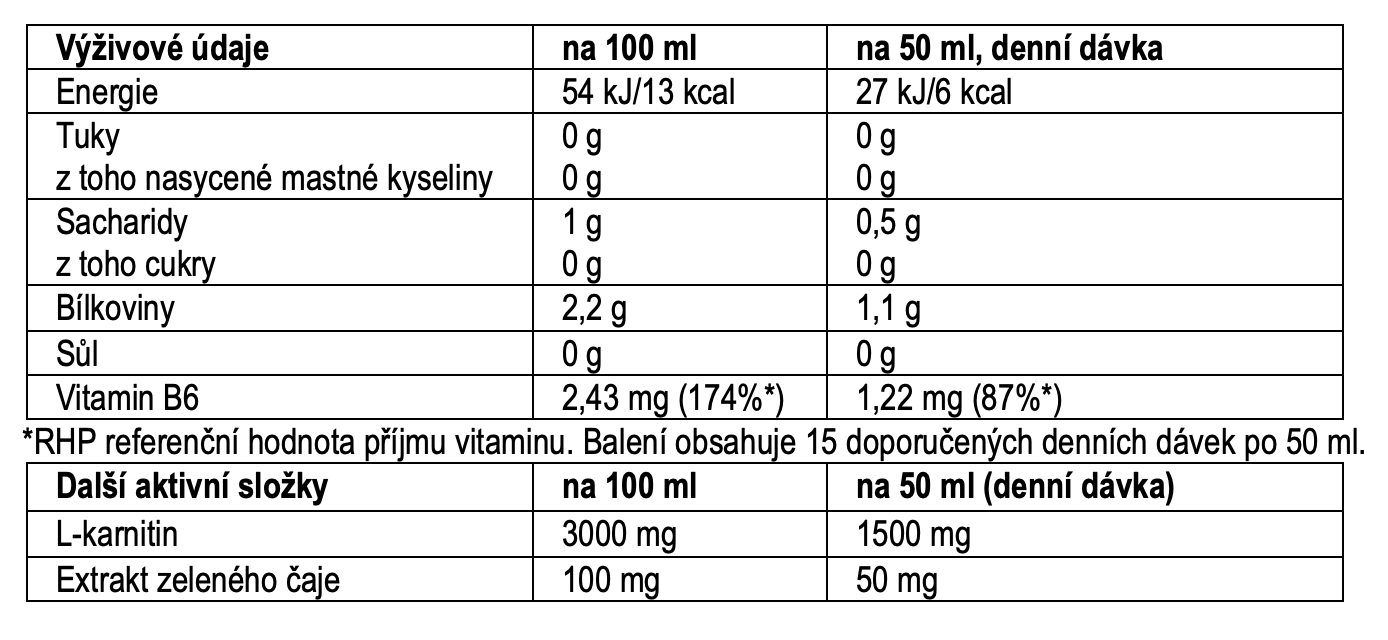 Složení: pitná voda, L-karnitin 3%, zvlhčující látka: glycerol, regulátor kyselosti: kyselina citronová, pomerančové aroma, extrakt zeleného čaje (Camellia Sinensis) 0,1 %, konzervanty: sorban draselný, benzoan sodný; sladidla: sukralosa, steviol-glykosidy ze stévie; vitamin B6 (pyridoxinhydrochlorid).