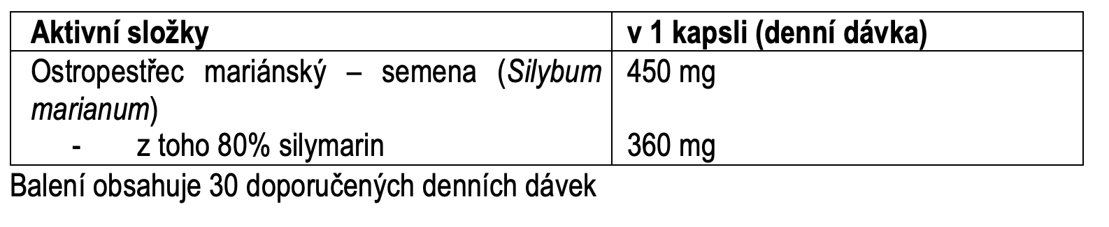 Složení: ostropestřec mariánský – semena (Silybum marianum), maltodextrin, rostlinná kapsle (plnidlo: hydroxypropylmethylcelulosa), emulgátor: hořečnaté soli mastných kyselin.