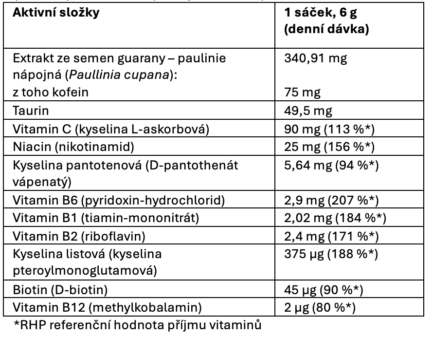 Složení: monohydrát dextrózy - glukóza, regulátor kyselosti: kyselina citronová, extrakt ze semen guarany – paulinie nápojná (Paullinia cupana), ananasové a citronové aroma, vitamin C (kyselina L-askorbová), barvivo: beta-karoten, taurin, niacin (nikotinamid), kyselina pantothenová (D-pantothenát vápenatý), sladidlo: steviol-glykosidy ze stévie, vitamin B6 (pyridoxin-hydrochlorid), vitamin B1 (tiamin-mononitrát), vitamin B2 (riboflavin), kyselina listová (kyselina pteroylmonoglutamová), biotin (D-biotin), vitamin B12 (methylkobalamin).