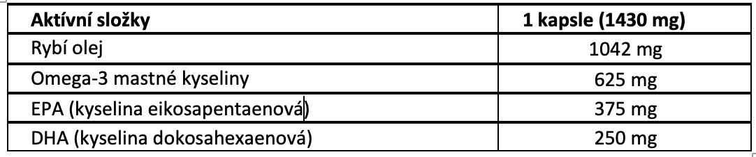 Složení (v denní dávce = 1 kapsle ~ 1430 mg): rybí olej (omega-3 mastné kyseliny: EPA, DHA), obal kapsle (hovězí želatina, pitná voda, zpevňující látka: glycerol), povrchová složka obalu kapsle (pitná voda, leštící látky: ethylcelulosa, alginan sodný; regulátor kyselosti: hydroxid amonný; triglyceridy se středním řetězcem, stabilizátor: mastné kyseliny), antioxidant: extrakt s vysokým obsahem tokoferolů.
