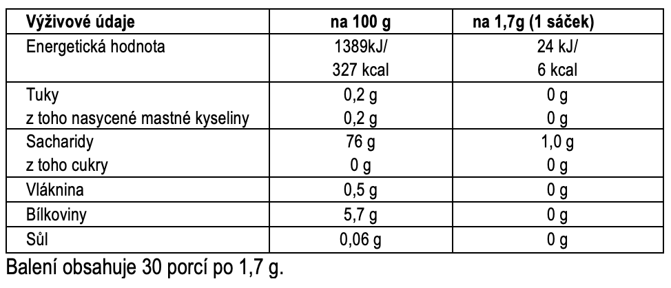 Návod k přípravě: Do šálky nasypte 1 sáček směsi (1,7 g). Zalejte 350 ml vroucí nebo studené vody, dobře promíchejte.