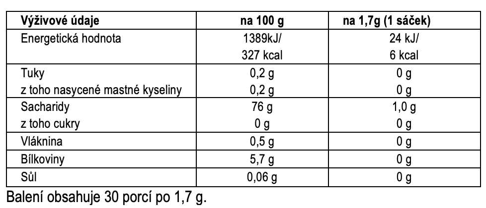 Návod k přípravě: Do šálky nasypte 1 sáček směsi (1,7 g). Zalejte 350 ml vroucí nebo studené vody, dobře promíchejte.